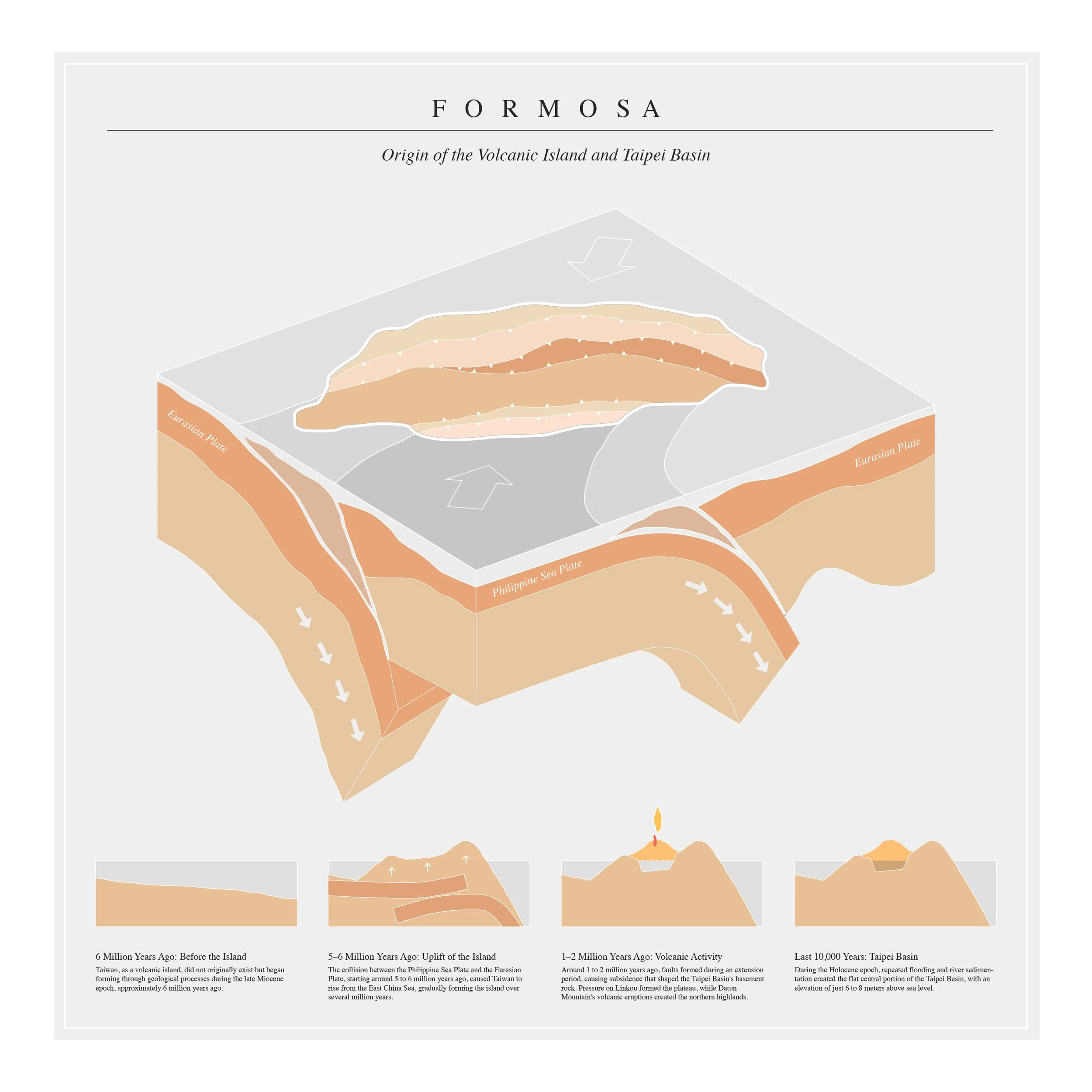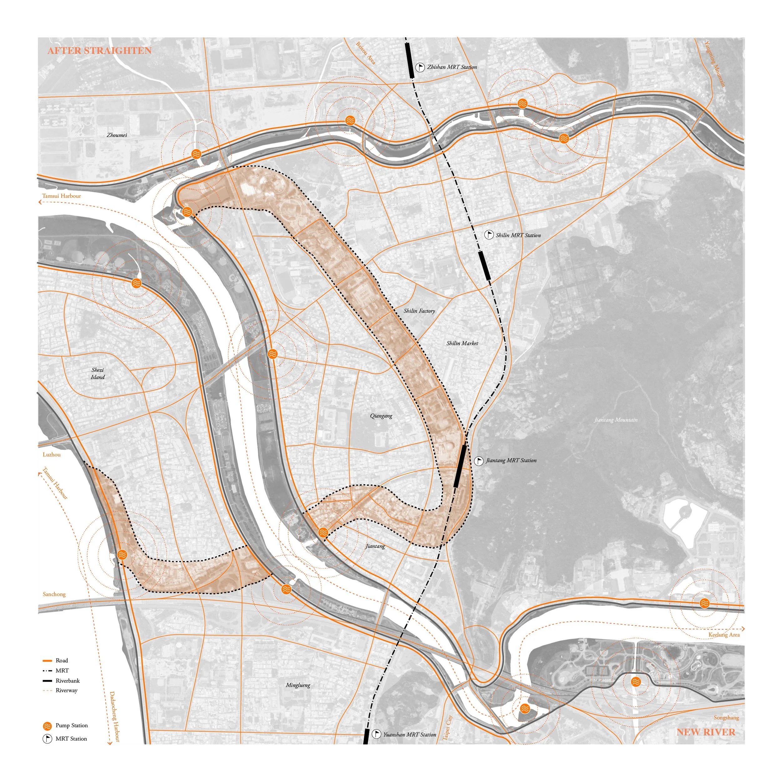 Originating from tectonic plate movements, Taipei Basin emerged as a shallow plain encircled by volcanic mountains and crisscrossed by rivers that early inhabitants relied on for farming, fishing, and trading. Over centuries, its riverscape was rewritten under colonial mandates, political upheavals, and catastrophic floods. Treated solely as an engineering problem, the government’s 1960s Keelung River straightening plan aimed to shield the growing metropolis from recurring deluges. In practice, it rerouted waterways, sealed tributaries, and filled old riverbeds—burying layers of asphalt and landfill atop centuries of environmental and social memory.