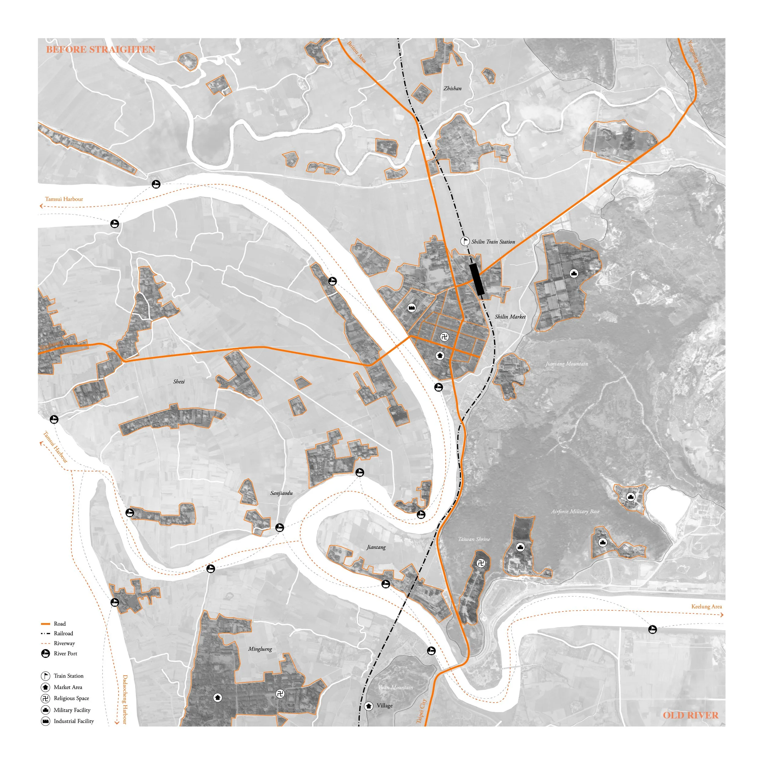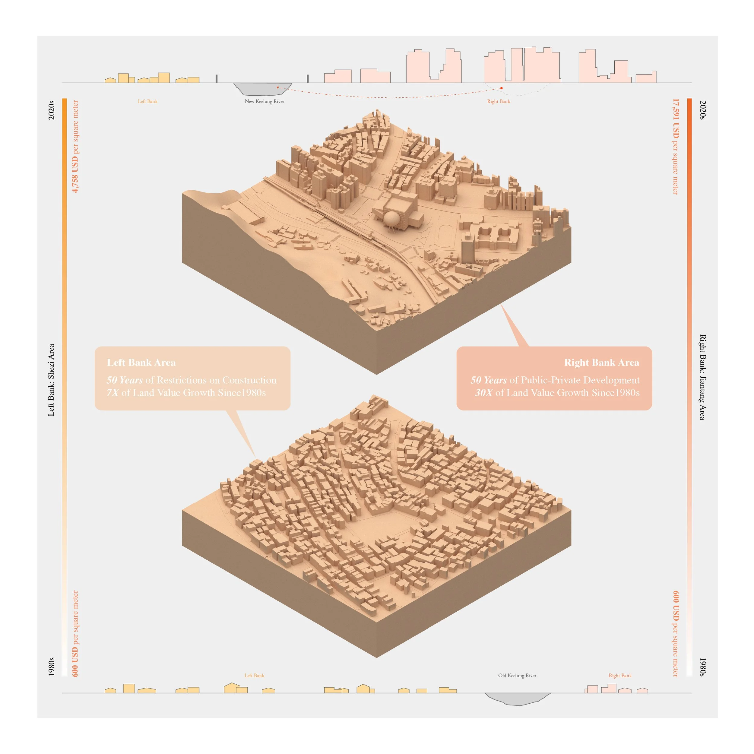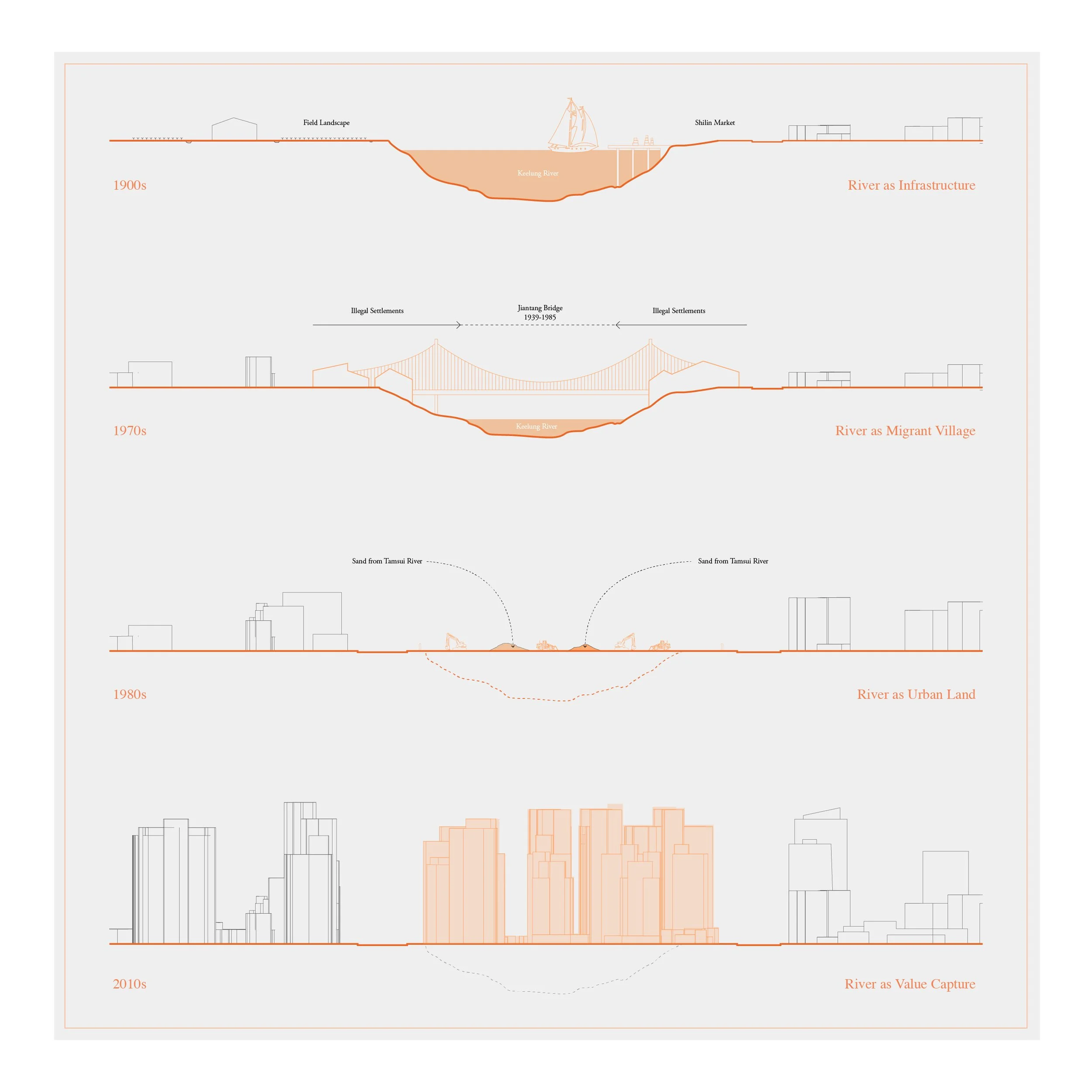 This project brings the story of this “invisible stream” to light by archiving from Qing-era diaries (late 1600s), Japanese colonial–era flood control plans (early 1900s), U.S. Army Corps consultations during the Cold War (mid 1900s), and GIS spatial analysis. The research unfolds in three phases: historical hydrology, mid-century rectification, and subsequent land redevelopment. Geo-visualizations trace lost river bends and newly formed urban blocks; oral histories reveal how communities adapted to shifting shorelines; and land-value data, combined with policy analysis, expose a dramatic economic rift along the redefined riverbanks. By revealing these transformations, the study demonstrates how top-down environmental planning reshaped Taipei’s lands, rivers, and societies, uncovering ecological disruption, social fragmentation, and economic disparity.