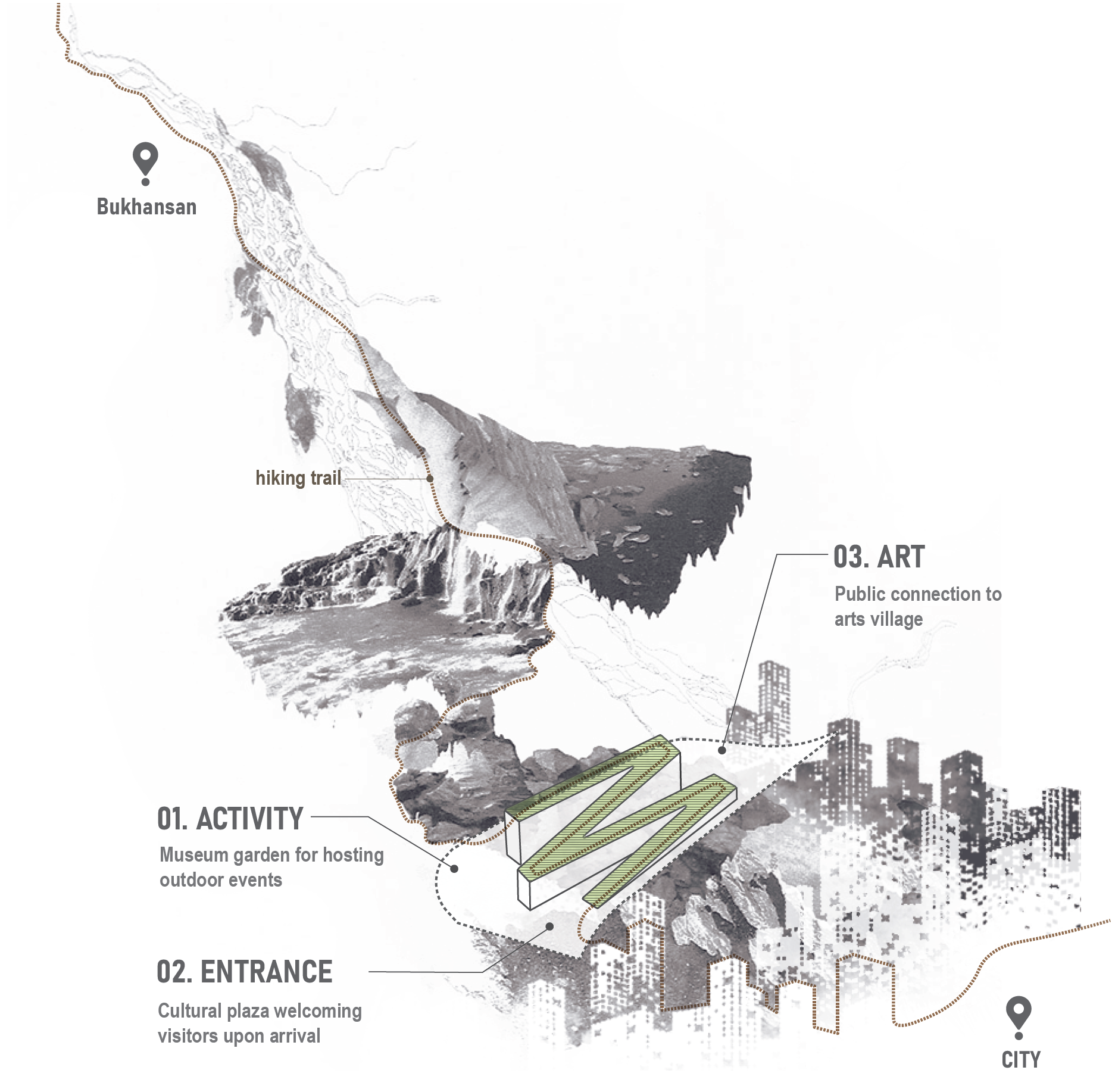 The museum's organization strategy gives form to the overall massing, which fits harmoniously in the hillside setting. The rooftop of the museum features a zigzagging path through a cascading garden that is integrated with the structural and skylight systems and filled with vegetation that reflects the seasons. The museum not only serves as a cultural landmark but also as a part of the system of hiking trails leading to Bukhansan National Park.