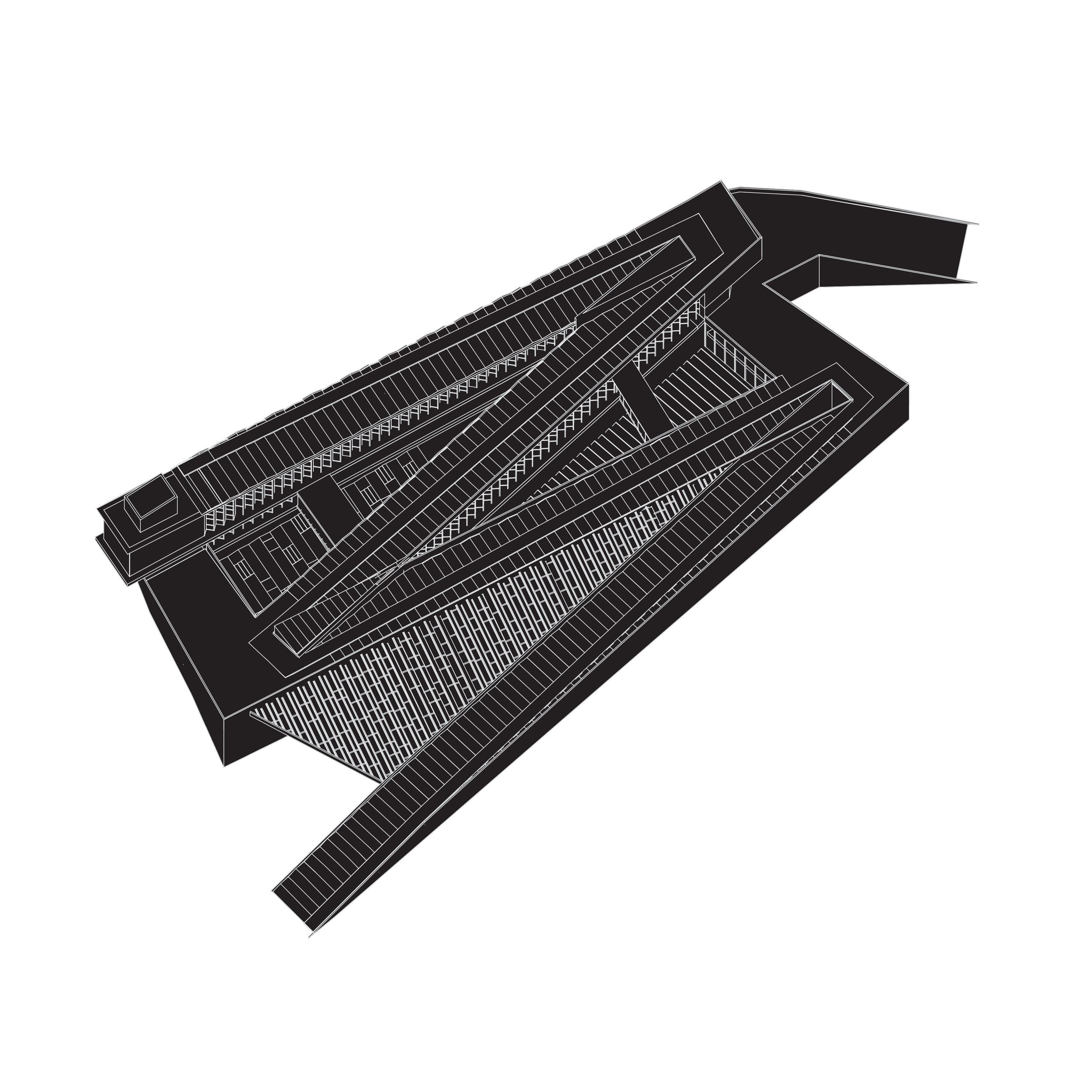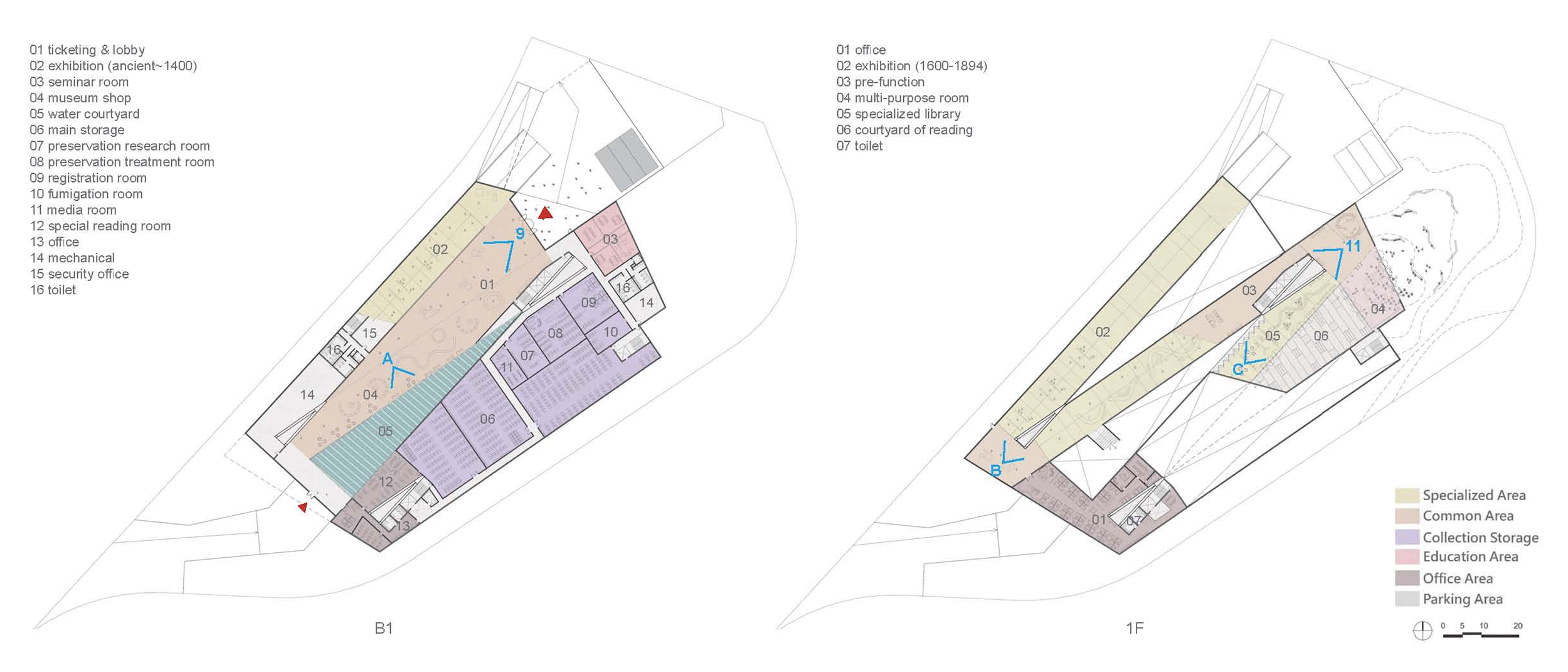 The design accomplishes that objective in its purest form by adopting a continuous exhibition path over four levels. Inspired by the cultural heritage of bookbinding – from the oldest surviving woodblocks and first movable metal type printing, to the folding of pages and unique covers. The project becomes an assemblage of Korean literature’s tangible components. The folding circulation route also encloses two distinct courtyards, one with a cascading water feature and the other a terraced garden, that offer moments of respite and contemplation through the interaction of indoor and outdoor spaces.
